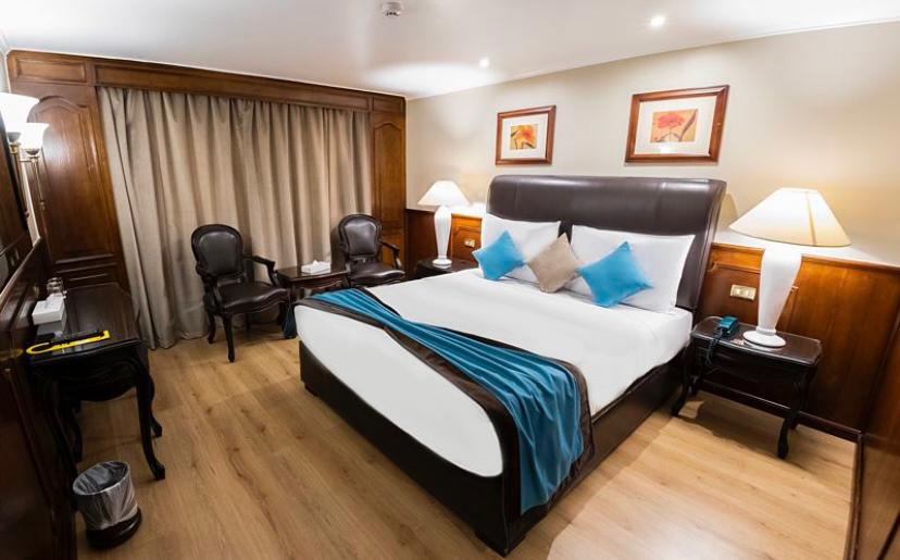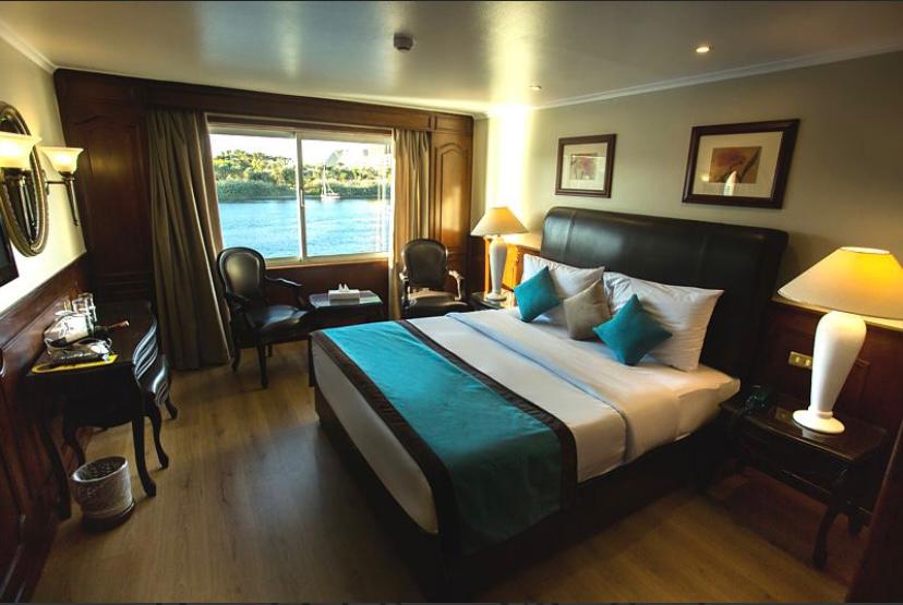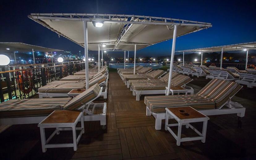 Guests can relax in the bar with Chesterfield sofas and panoramic views of the Nile, or enjoy the sun deck with its swimming pool, bar, and comfortable loungers.