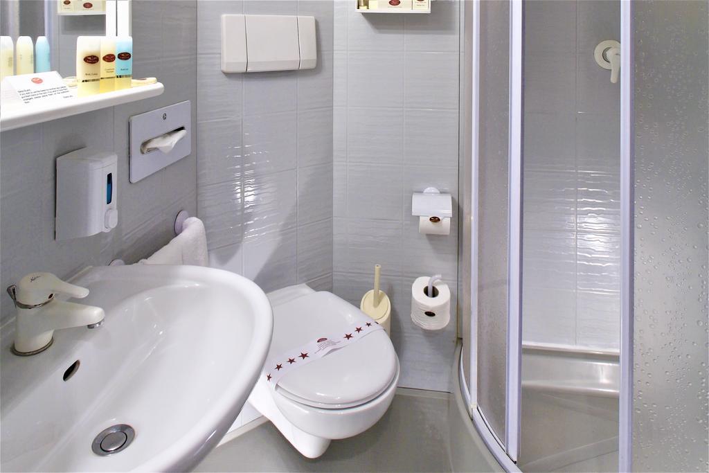 Private bathroom with shower and hairdryer.